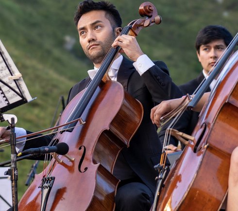 An der Bergstation der Schlossalmbahn und umgeben von imposanten Gipfeln wie Mauskarspitze und Hirschkarspitze genießen Konzertgäste einen traumhaften Musikabend.
