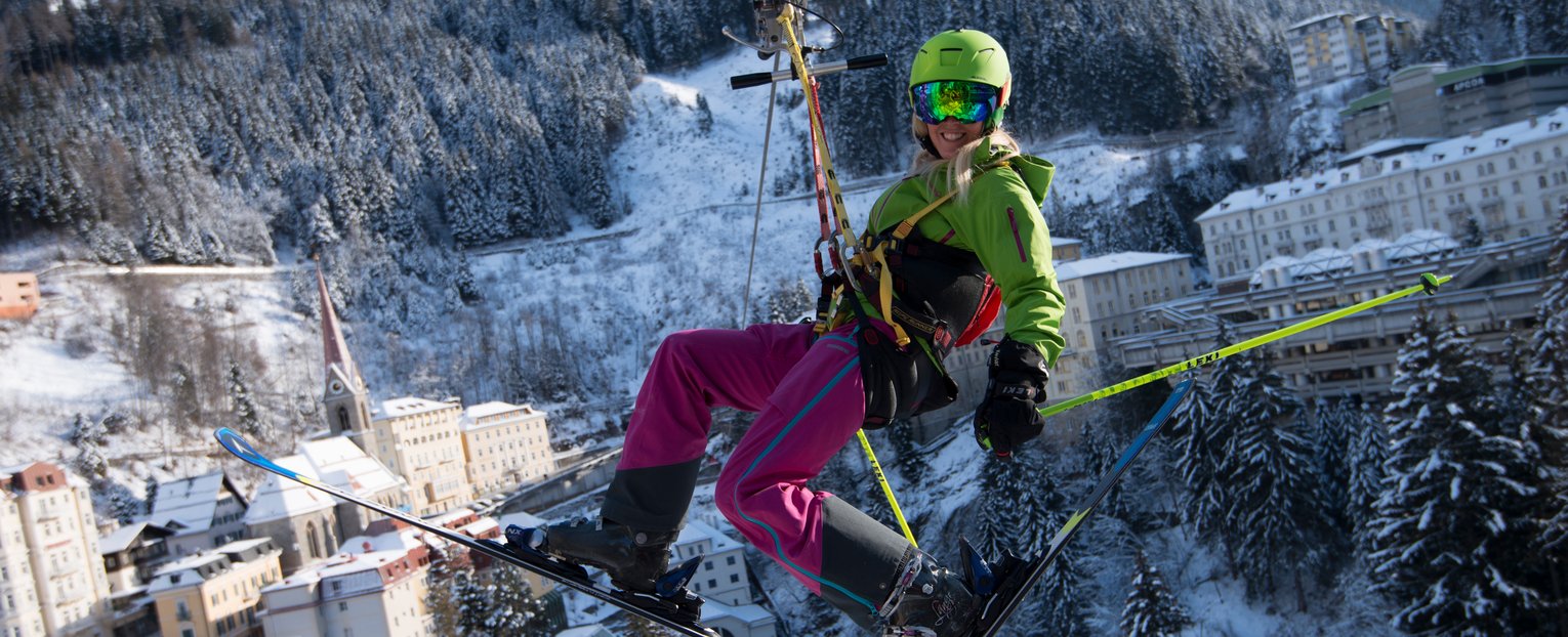 Auf einer gesicherten Stahlseilrutsche rauscht man in 90 Metern Höhe über die wilde Schlucht der Gasteiner Ache. Startpunkt ist die historische Villa Solitude, die Landung erfolgt im idyllischen Thermalquellpark. Während des rasanten Gleitfluges fällt der Blick auf ein Panorama, das seinesgleichen sucht: Der imposante Wasserfall, die prächtige Belle-Époque-Architektur und die Berge der Hohen Tauern bilden zusammen eine einzigartige Kulisse.