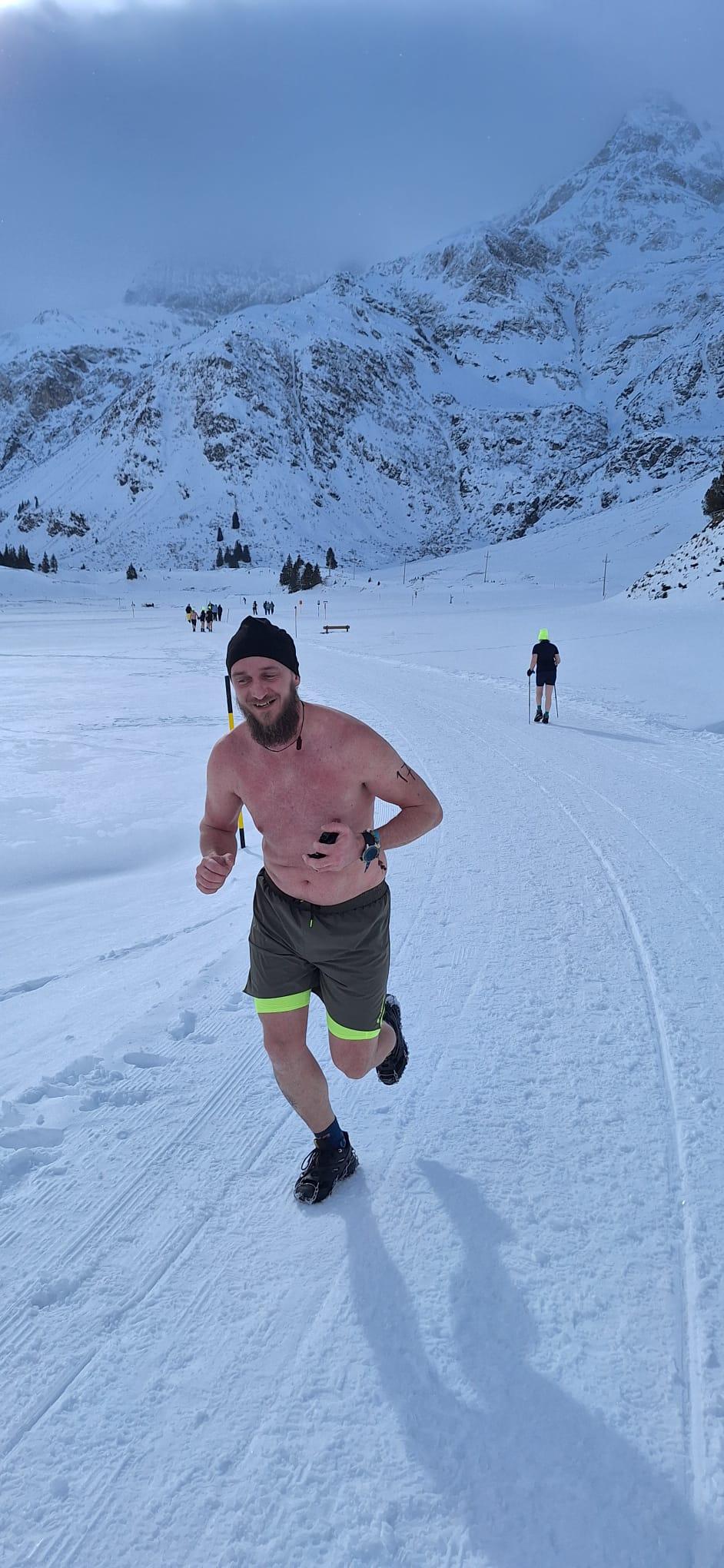 Die Teilnehmer*innen wagen sich bei Minustemperaturen nur leicht bekleidet auf Langlaufskiern durch die Winterlandschaft, bevor sie sich in ein Eisbad begeben.