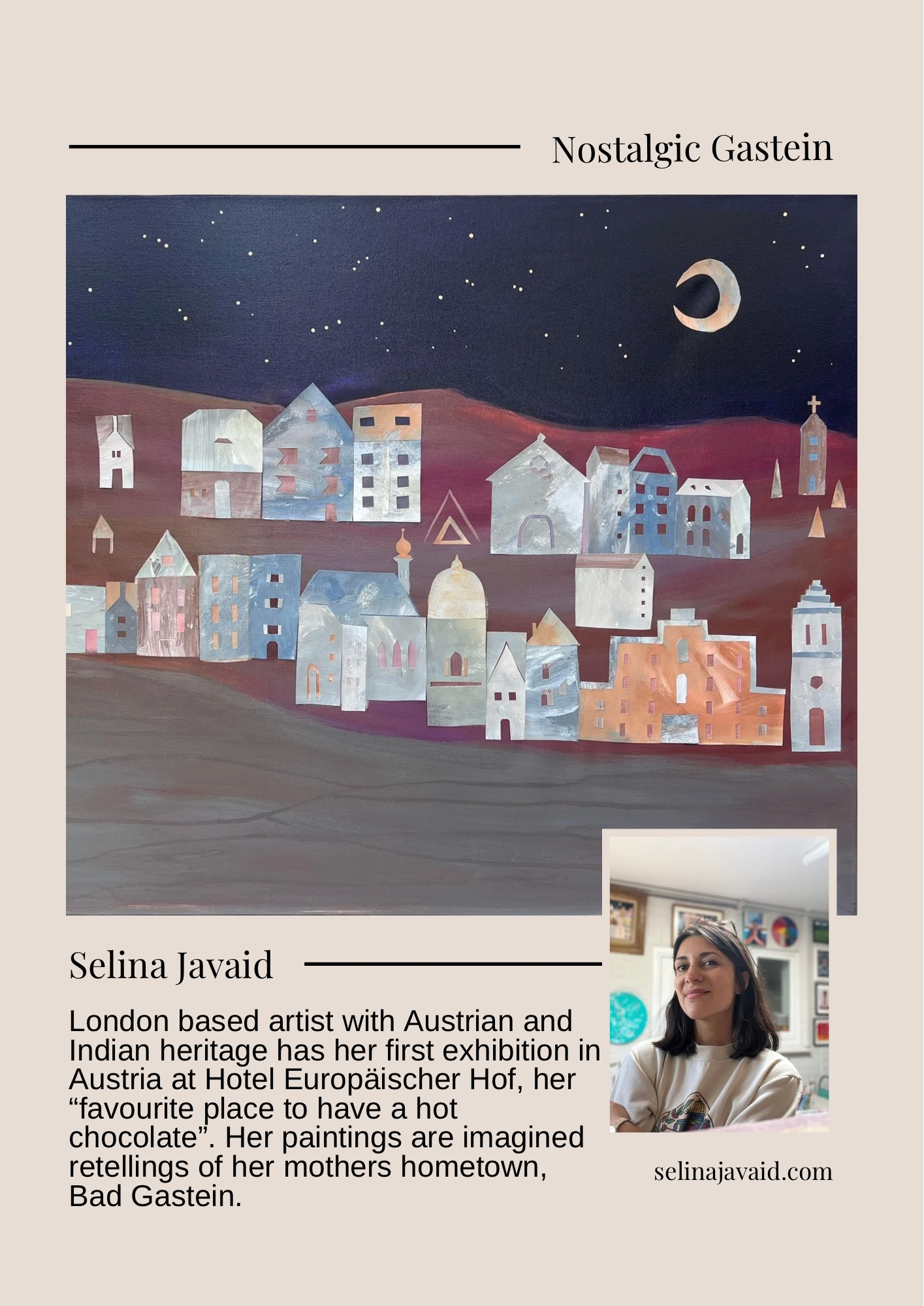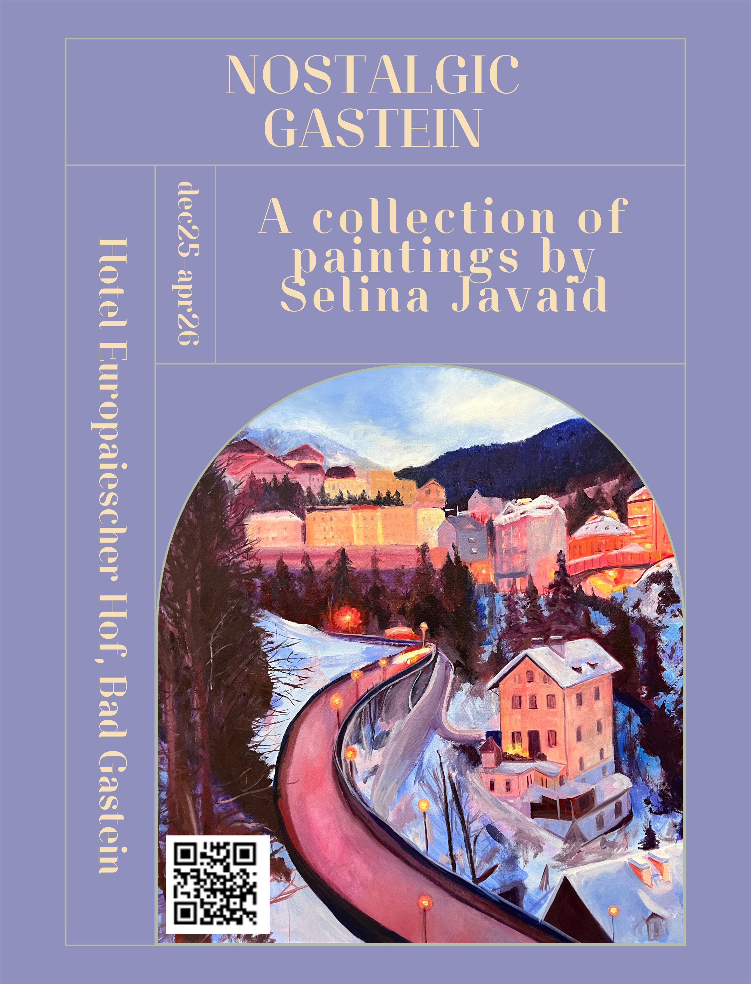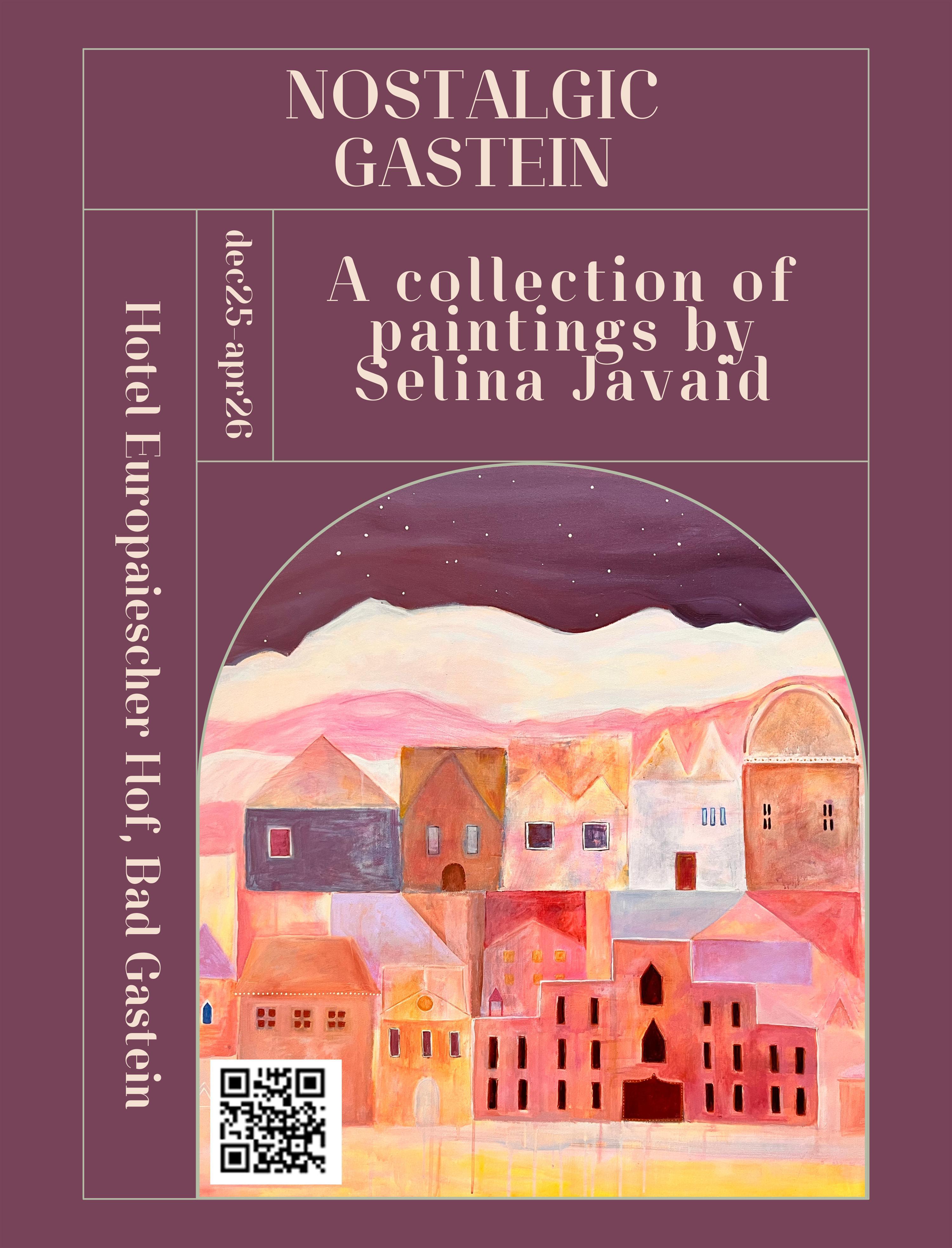 Mein Name ist Selina Javaid, ich bin Künstlerin und Pädagogin. Meine Mutter ist Österreicherin, sie wurde in Bad Gastein geboren, und meine Großmutter, Linde Egger, lebt noch immer in Bad Bruck. Wir besuchen sie jeden Sommer und Winter. Meine schönsten Erinnerungen sind mit Gastein verbunden. Jetzt bringe ich auch meine eigene Familie jedes Jahr mit. Es ist mein Traum, meine Bilder in Bad Gastein auszustellen, da ich dort viel Inspiration finde.