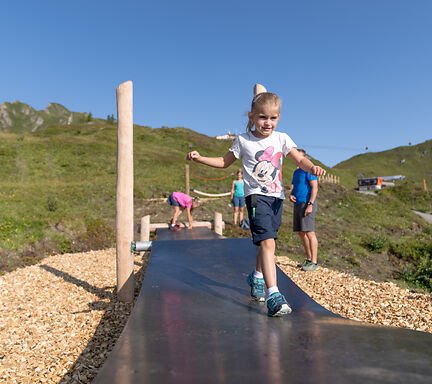 Direkt unterhalb der Bergstation eröffnet sich für Kinder ein kleines Paradies. Während die Minis am Spielplatz klettern, rutschen und lachen, genießen die Eltern den Ausblick. Der Slackline-Park bringt zusätzlichen Spaß: Wer schafft es, mit sicherem Schritt über die Seile zu spazieren?